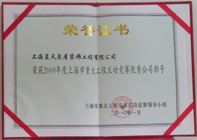 2010年1月,藍(lán)天公司第五次被上海市重點(diǎn)工程實(shí)事立功競(jìng)賽領(lǐng)導(dǎo)小組評(píng)為優(yōu)秀公司,這是藍(lán)天公司自2005年以來(lái),第五次被評(píng)為優(yōu)秀公司。