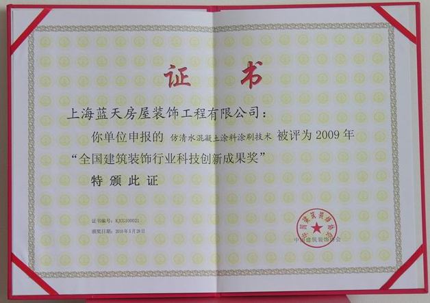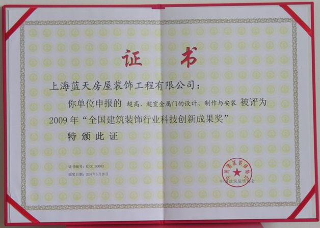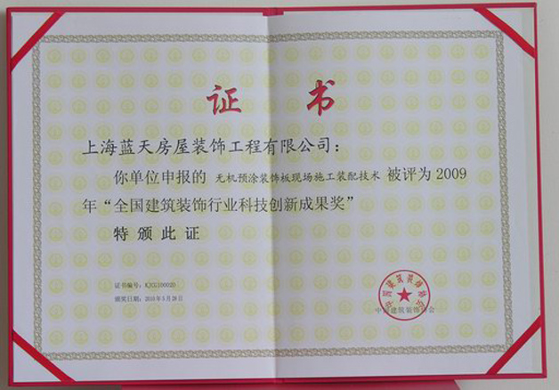 2009年藍(lán)天公司的“無機(jī)預(yù)涂裝飾板現(xiàn)場施工裝配技術(shù)”、“仿清水混凝土涂料涂刷技術(shù)”、“超高、超寬金屬門的設(shè)計、制作與安裝”這三項(xiàng)技術(shù)被評為全國建筑裝飾行業(yè)科技創(chuàng)新成果獎。