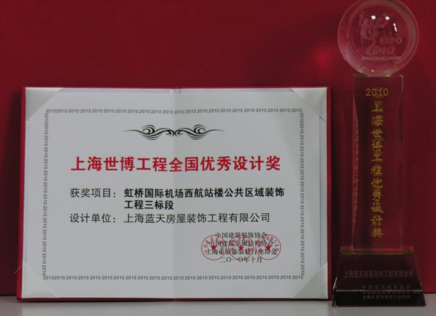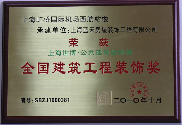 2010年10月,由藍天公司承建的上海虹橋國際機場西航站樓裝飾裝修工程榮獲上海世博·公共建筑裝飾類全國建筑工程裝飾獎和上海世博工程全國優(yōu)秀設計獎。