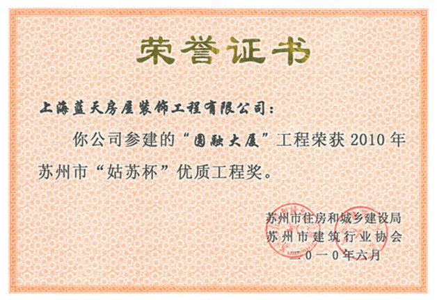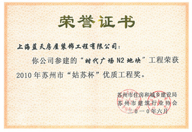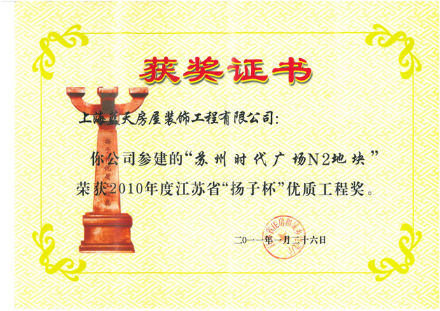藍天公司蘇州圓融國稅、時代廣場N2地塊這兩個裝飾工程榮獲2010年蘇州市“姑蘇杯”優(yōu)質(zhì)工程獎。2011年1月,兩工程榮獲2010年度江蘇省“揚子杯”優(yōu)質(zhì)工程獎。