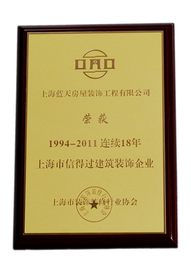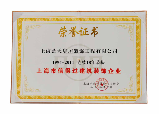 1、藍(lán)天公司1994-2011 連續(xù)1年榮獲上海市信得過(guò)建筑裝飾企業(yè)。