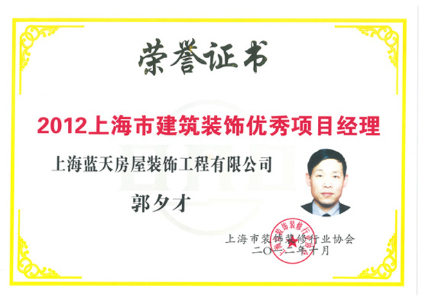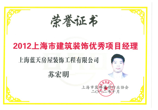 3、藍(lán)天公司項(xiàng)目經(jīng)理蘇宏明、郭夕才被評(píng)為“2012上海市建筑裝飾優(yōu)秀項(xiàng)目經(jīng)理”。