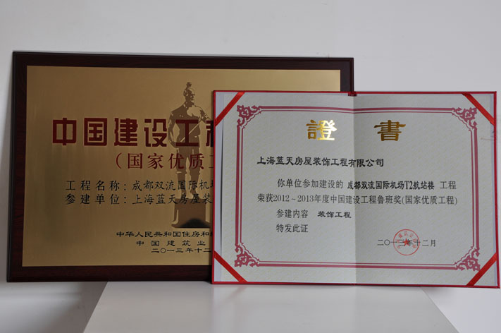 2013年12月,藍(lán)天公司上海卷煙廠“中華”牌卷煙專用生產(chǎn)線技術(shù)改造項(xiàng)目工程、成都雙流國際機(jī)場T2航站樓工程雙雙榮獲2012~2013年度中國建設(shè)工程魯班獎(國家優(yōu)質(zhì)工程)。