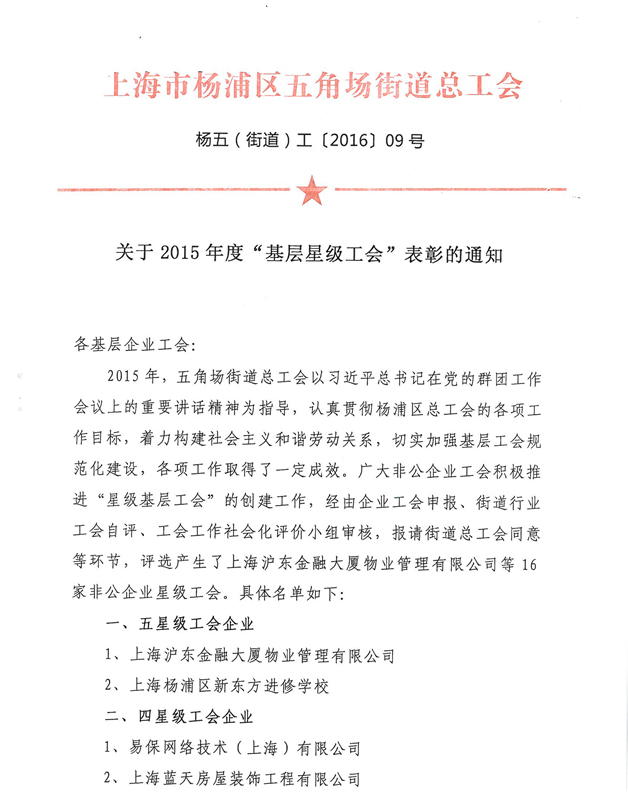 2016年4月15日,五角場總工會(huì)召開2015年度“星級工會(huì)”總結(jié)頒獎(jiǎng)暨2016年工會(huì)工作推進(jìn)會(huì),16家非公企業(yè)獲評“基層星級工會(huì)”。五角場總工會(huì)主席呂曉鈞同志出席會(huì)議并作重要講話,會(huì)議由專職副主席鄭蓉同志主持。