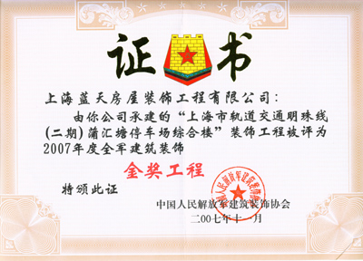 2007年,藍(lán)天公司被評(píng)為全軍建筑裝飾行業(yè)誠(chéng)信企業(yè);軌道交通蒲匯塘停車場(chǎng)綜合樓裝飾工程被評(píng)為全軍“金獎(jiǎng)工程”。